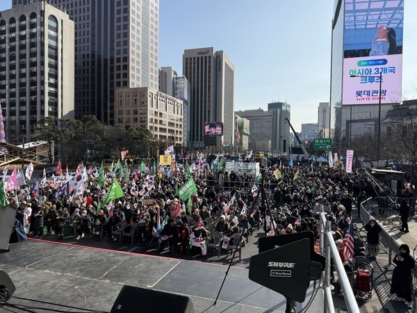31일 이재명 정부의 안보 무력화와 교회 탄압에 대해 중단을 촉구하기 위한 ‘광화문 국민대회’가 대한민국바로세우기국민운동본부(대국본) 주최로 서울 광화문 동화면세점 앞에서 열렸다. 애국시민 12만여 명(주최측 추산)이 모인 이날 집회에서는 △드론사령부 해체 등 안보 기반 무력화 △정교분리 원칙을 왜곡한 교회탄압 △전광훈 목사 구속 비판 △노동신문 비치 규탄 △헌재의 3% 비례대표 봉쇄조항 위헌 결정 관련 자유통일당의 국회 진입 주장 등 다양한 이슈를 제기하고 비판했다.