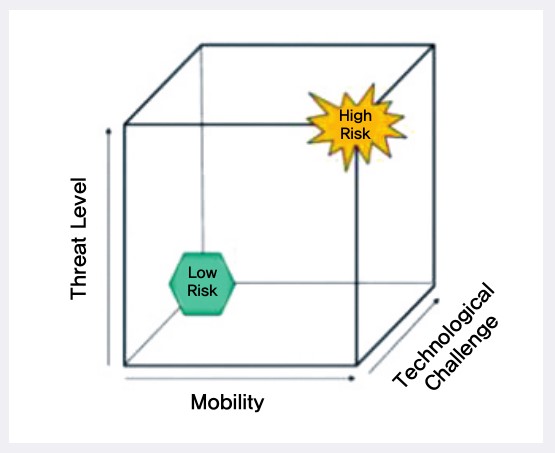 EMI의 위험성은 [그림 12]와 같이 ‘EMI 위험성 평가 큐브’에 따라 평가가 가능하다. 이 위험성 평가 큐브에 따르면 세 가지 변수에 따라 EMI의 위험성을 평가하는데, 그 세 가지 구성요소는 위협수준TL Threat Level, 이동성MMobility, 기술적 도전TCTechnological Challenge이다. 이 3가지 요소를 통해 EMI의 위험성을 어떻게 판단하는지 알아보자.