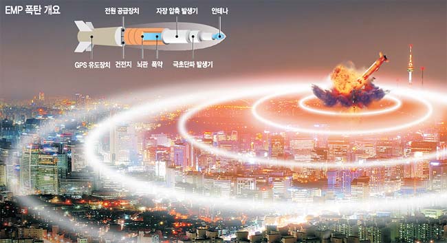 이렇게 전자기기를 많이 사용하는 전쟁 상황에서 [그림 3]과 같이 적이 EMI 공격을 한다면 EMI 공격의 사정권에 있는 전자기기는 제 기능을 못할 것이다. 아군의 군사지휘통제(C4I) 시설이 제 기능을 하지 못해 원활한 지휘통제가 불가능해지고, 최첨단 무기들이 정상적으로 작동하지 못하게 된다. EMI 공격만으로 아군의 전투력이 급감하게 되는 것이다.