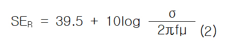 전자기파의 반사(SER)는 외부에서 입사되는 전자기파가 최초에 차폐물질의 표면에 닿았을 때, 차폐물질의 표면에서 전자기파가 표면반사되는 현상이다. 표면반사는 전자기파가 도체에 닿았을 때 크게 발생 하는데, 이는 도체물질로 구성된 차폐물질의 전도율(Conductivity : σ)이 크기 때문이다. Eq.(2)와 같이 전도율(σ)이 클수록 반사되는 전자기파의 크기가 커지기 때문에 전도율이 높은 재료를 사용하여 차폐물질을 만드는 경우가 많다.