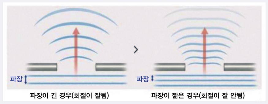 둘째, 파장이 길면 회절Diffraction이 크게 일어난다. 회절은 파동이 공간에서 진행하다가 장애물을 만났을 때 장애물 뒤쪽으로 돌아 들어가는 현상으로 [그림 8]과 같이 발생한다. 회절의 정도는 파장의 길이에 따라 결정되어 파장이 길면 길수록 회절이 더 잘 일어난다.