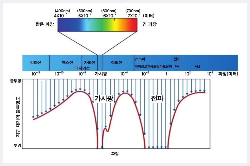 전자기파의 종류는 [그림 9]에서 확인할 수 있듯이 파장이 가장 짧은 감마선을 시작으로 엑스선, 자외선, 가시광선, 적외선, 그리고 파장이 가장 긴 전파가 있다.