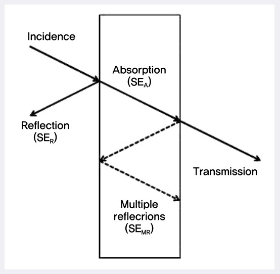 차폐가 이루어지는 원리는 [그림 13]과 같다. 외부의 전자기파가 차폐재료에 입사Incidence 했을 때 전자기파의 반사(SER)와 흡수(SEA), 다중반사(SEMR)가 발생한다. 이로 인해 전자기파가 감쇄하고 나머지 전자기파만 차폐재료를 통과하게 된다. 이를 식으로 나타내면 Eq.(1)이다.