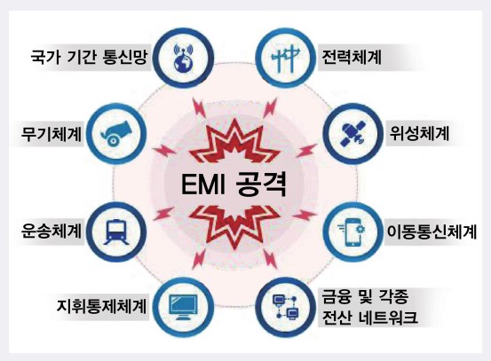 산업분야에서 전자기기의 사용도 매우 많아지고 있다. 우리 생활에서 모든 산업의 동력이 되는 전기를 공급하는 전력체계도 전자기기를 통해 관리되고 있어서, 발전소나 한국전력이 EMI 공격을 받을 경우 전력공급에 큰 문제가 발생할 수 있다. 또한 금융 및 전산네트 워크가 EMI 공격을 받아 마비될 경우 산업 전반적인 금융활동에 큰 문제가 발생할 수 있다.