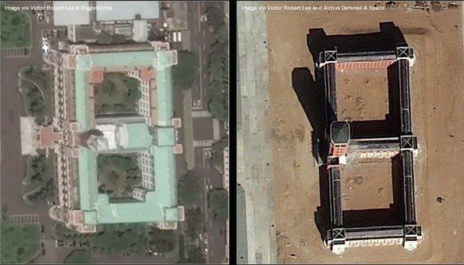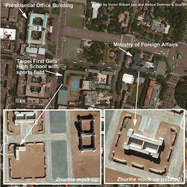 ↓ 대만 총통궁과 그 주변 주요 시설들을 PLA 朱日和训练基地(Zhurihe 군사 훈련기지) 에 목업 시설로 지은 위성사진 비교