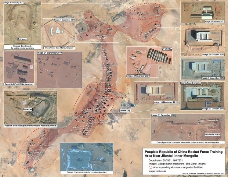 ↓ 2019, 2020, 2021년까지 미국 과학자 협회가 민간 감시 위성을 사용하여 在內蒙吉蘭泰鎮附(내몽골 질란타이 도시) 근처에 중국 로켓 부대들의